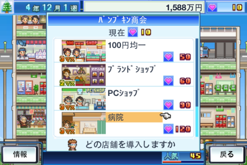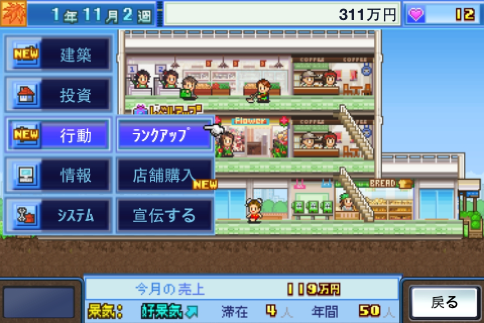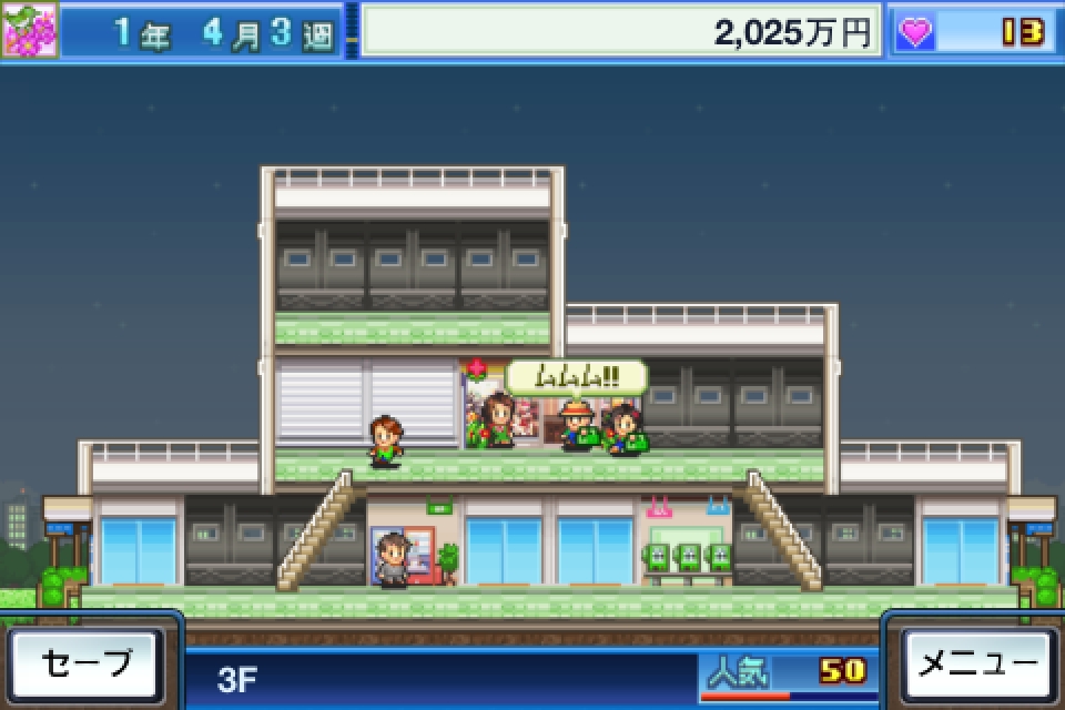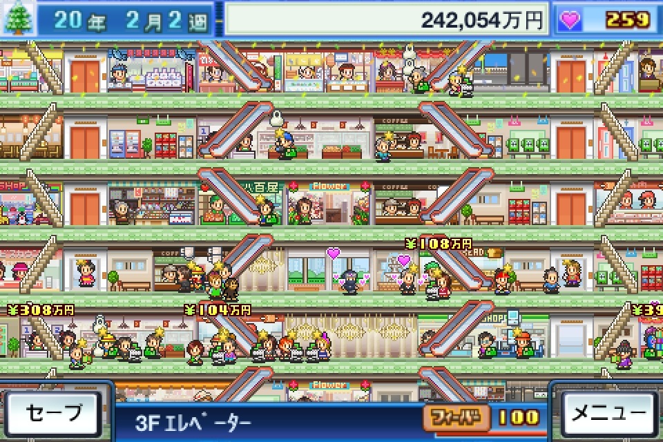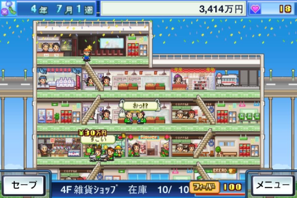 遊戲一開始將獲得 2000 萬日幣的創業基金、兩家小店面以及隨時回報公司狀況的專屬祕書。接著商場就會馬上開始營運,前來消費的客人會陸續從大門湧入至各家店面購買東西,到了每個月的最後一天,商場會自動打烊,並且結算當月營業額。