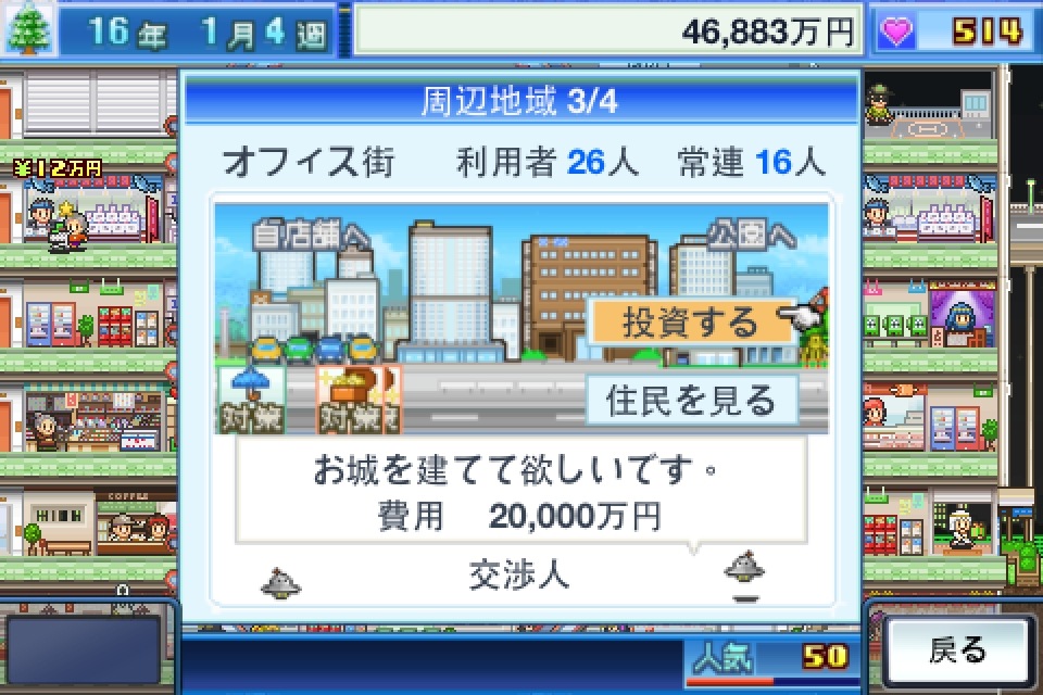 累積賺來的錢後就要逐步擴張營業項目,至建築選單中購買新的設施、商鋪或特殊建築等,設施包含樓梯、電話亭、ATM、水晶擺設、廁所、休息區、建築拆除與置換等,而商鋪更多種,有化妝品店、鞋店、肉店、食品店、雜貨店、麵包店、寶石店、壽司等,特殊建築則是一些功能類的設施,如地下鐵、高速公路、停機坪、水族館、賭場等,可能引起民眾討論或方便客人前來的設施。