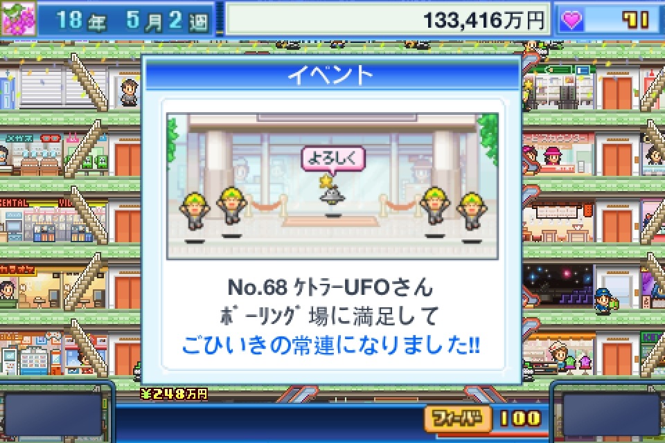 想要解鎖新的建築,必須利用客人消費滿意後給予的「顧客滿意度」,到行動選項中的「商舖購入」購買新商店,或是由客人贈送、完成特定條件而獲得,再花錢把商店裝置在商場中。