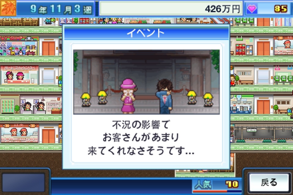 除此之外,只要完成特定條件,累積得到的人氣值到 100 就會有大批人潮湧現,或者在每年的 12 月「年末商戰」也會吸引大量客人購買東西,而年末商戰結束也就是一年的最後一天,將會有各國最佳商店評比比賽,有機會得到高額獎金。