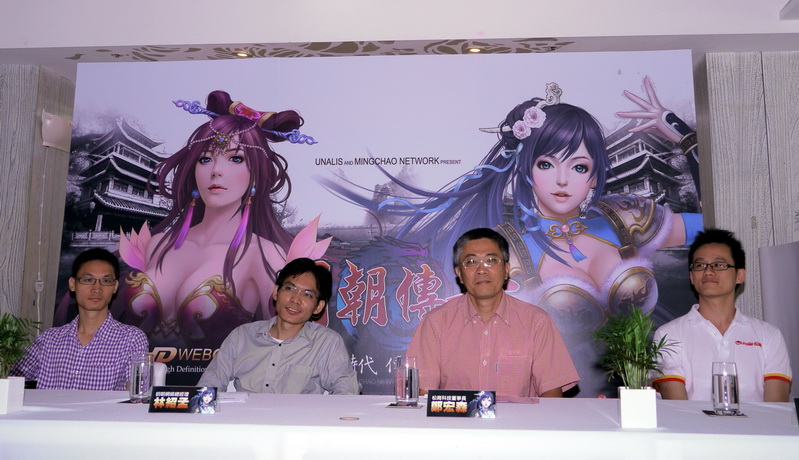 明朝傳奇 》今日舉辦封測記者會,松崗董事長鄭宏森、明朝網絡總經理林紹孟、明朝網絡製作總監戚任雄與松崗科技產品經理林哲賢共同出席。鄭宏森表示,2009 年松崗想要踏入網頁遊戲營運的領域時,那時候就看中這個研發團隊的作品《