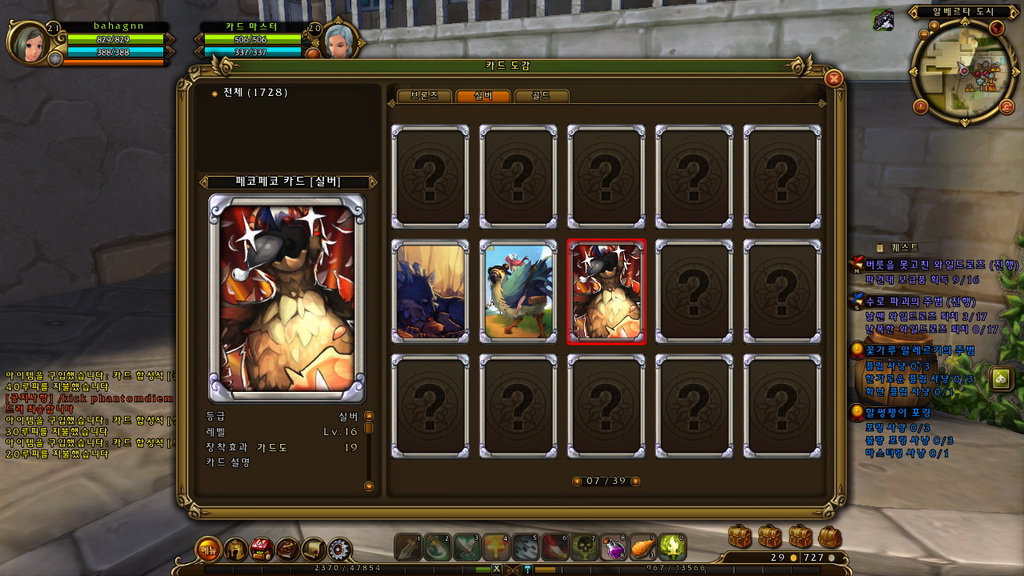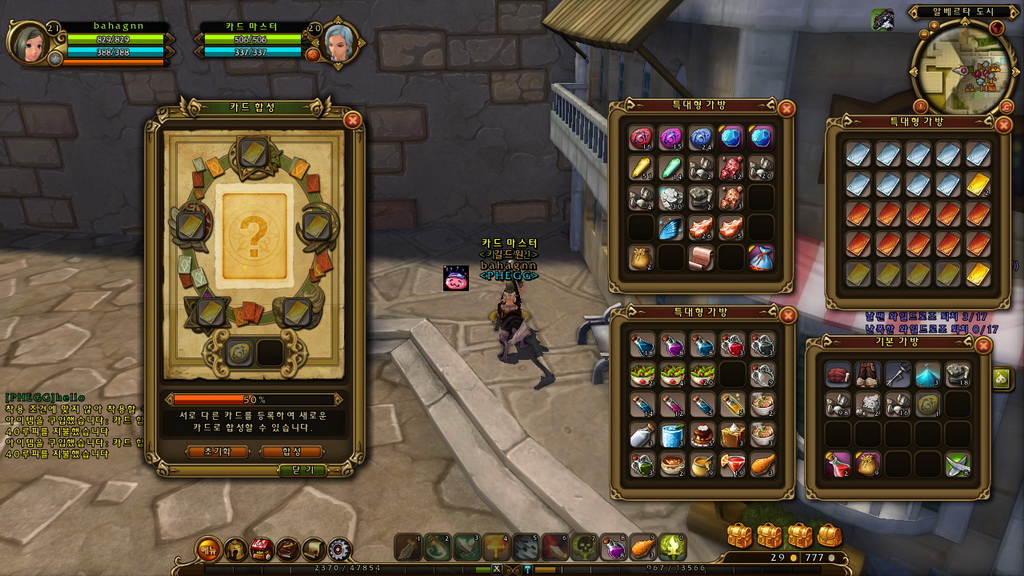 另外,怪物卡片還有強化與合成兩種特色系統,強化方面需先與卡片師 NPC 購買強化捲軸,打開捲軸後可在上面放置 2 到 5 張相同樣式、品階的怪物卡片,再點擊強化鈕就能為該張卡片升一個品階,而放置的卡片多寡則是影響強化成功率,2 張有 40%、3 張 60%,百分之百成功則需要 5 張。