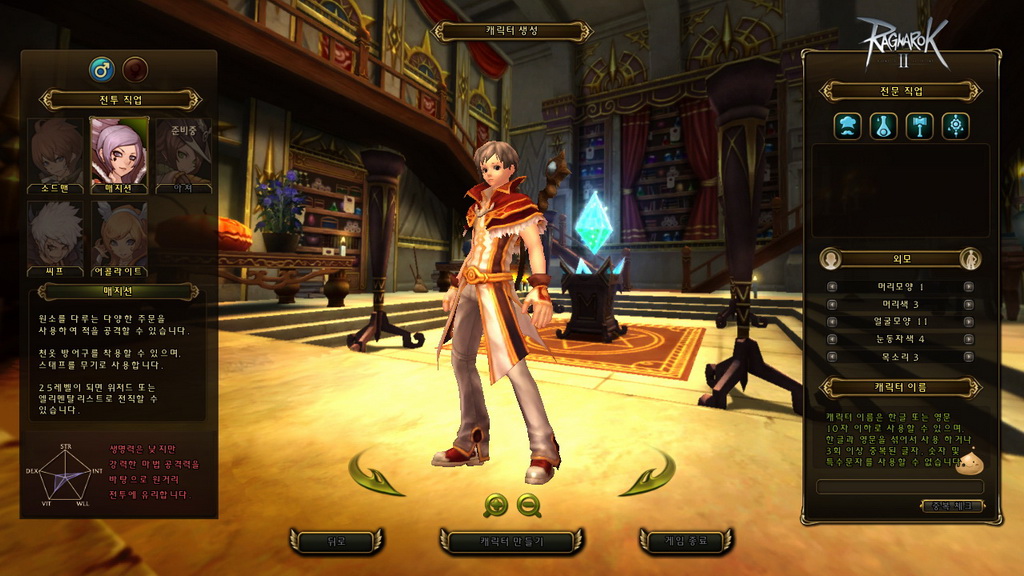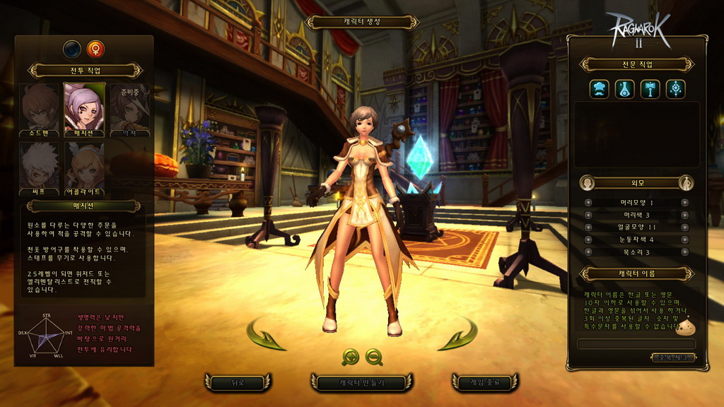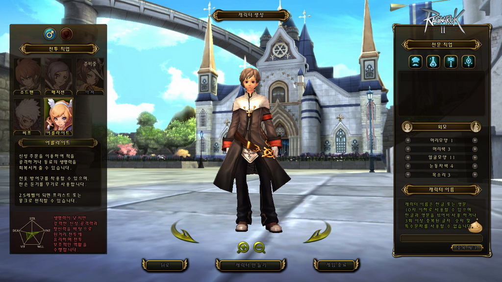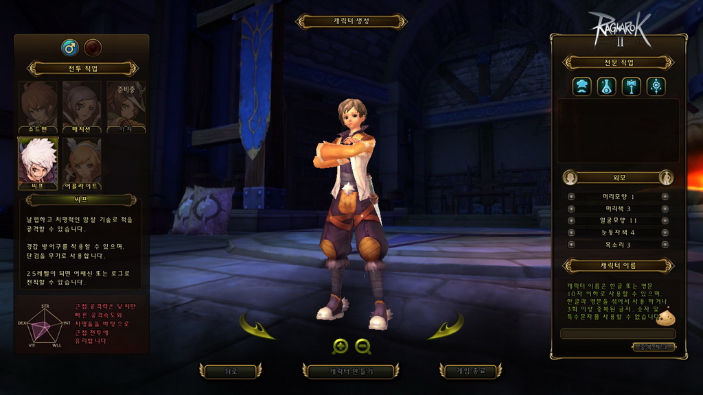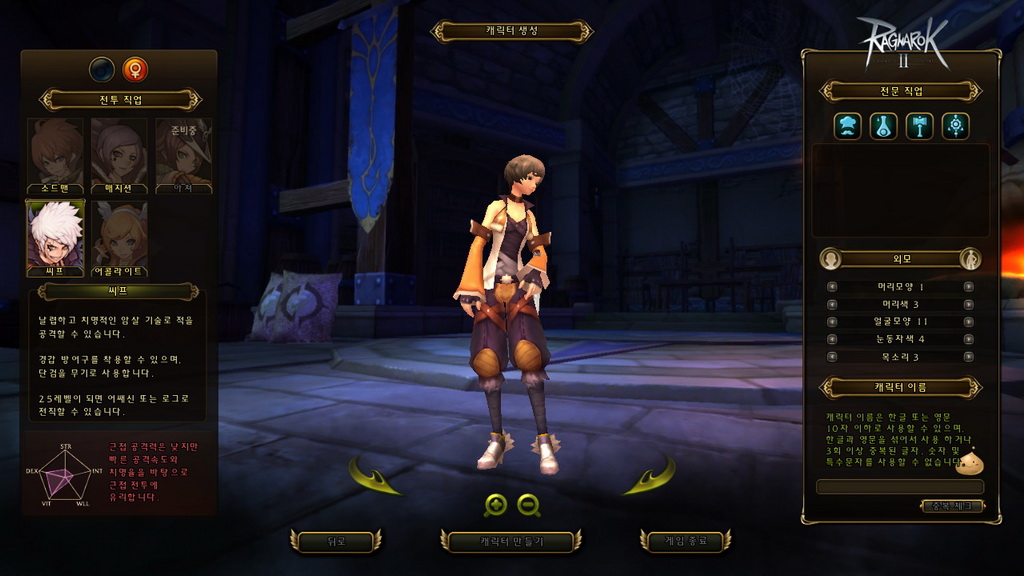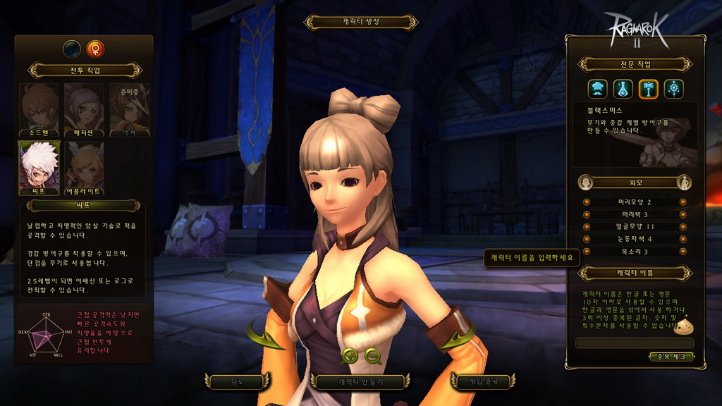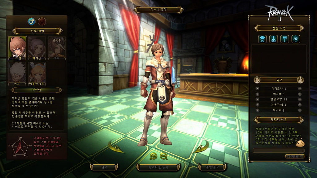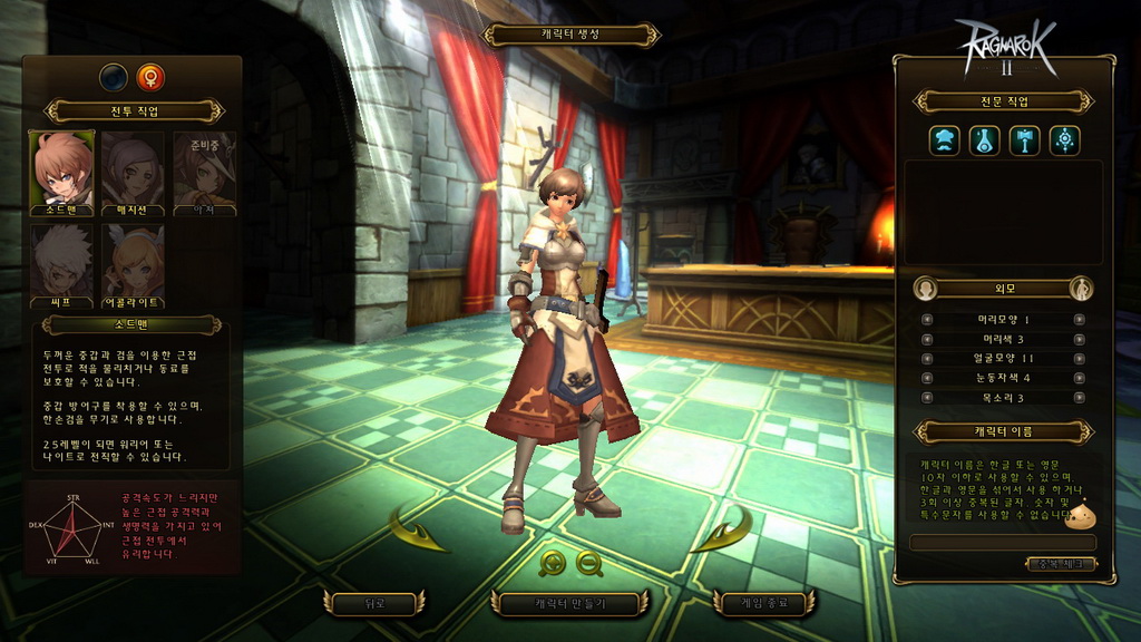 玩家在進入遊戲前,需先創建角色,包含職業、生活職業、性別與人物外觀等選擇,職業方面可扮演盜賊、劍士、服事、法師 4 種(本次測試未開放弓手),生活職業則是有廚師、鍊金、鐵匠與裁縫 4 類,接著還有髮型、髮色、眼型、眉型、聲音等基本大項調整,完成後就正式進入遊戲了。