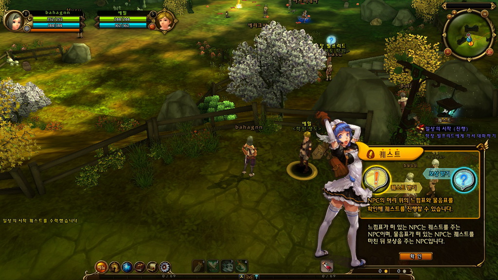 進入遊戲之後,可以看到右下角有「小提示」視窗提示玩家基本系統說明,協助我們更快了解遊戲,像是 NPC 頭上出現驚嘆號代表有新任務、問號代表任務完成可回報、對怪物點右鍵進行攻擊等。