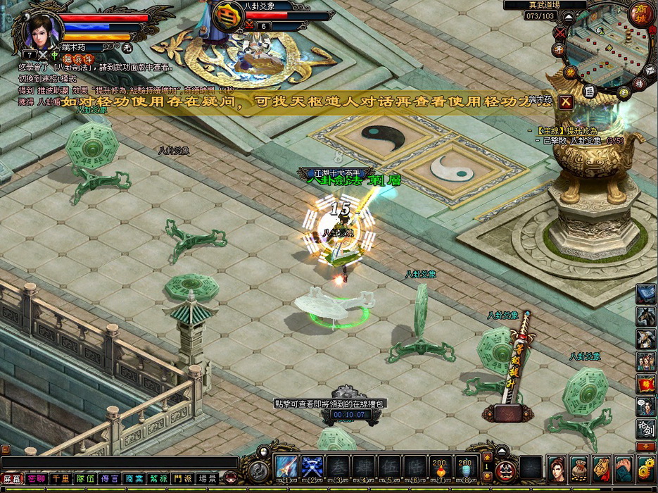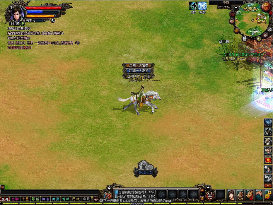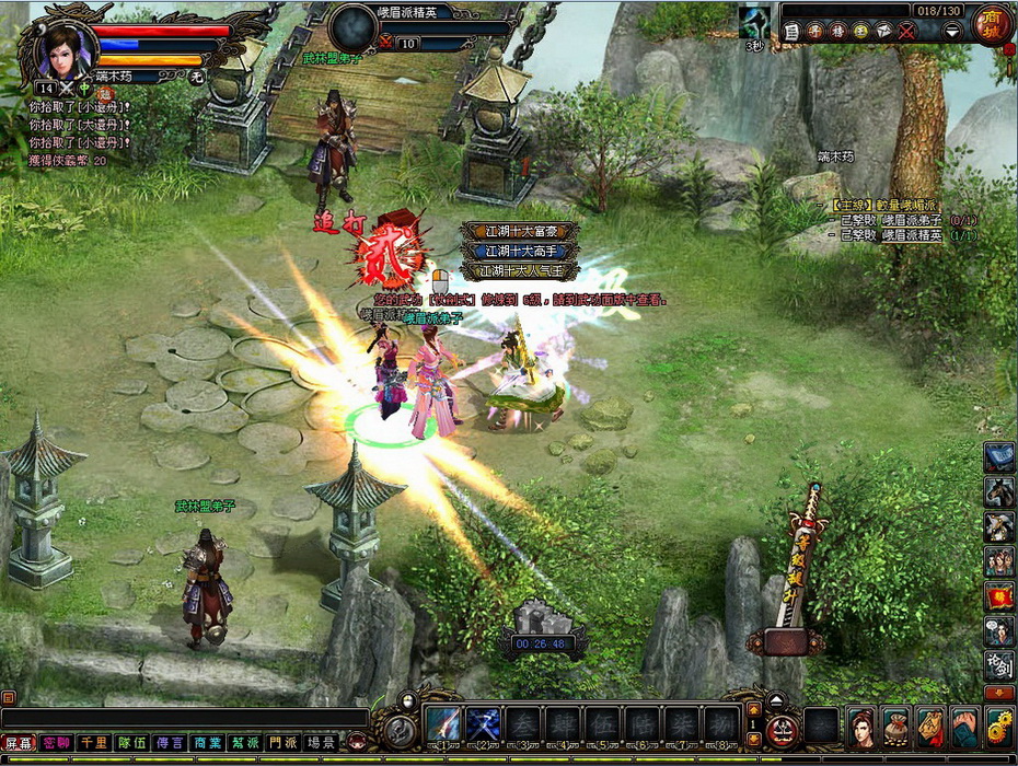 當等級不斷提升,角色也已經有一定水準的武功修為,接下來就可在遊戲內任意的闖蕩江湖,並跟著任務的指引到達各式各樣的場景,挑戰以往不同的怪物,經由擊敗這些怪物玩家可隨機獲得豐厚的獎勵;其中,心法類的秘笈算是不錯的獎賞,心法秘笈在取得後可進行修煉,修煉成功後可按照玩家修練的方向提升玩家的身法、閃避機率以及提高血量…等等。