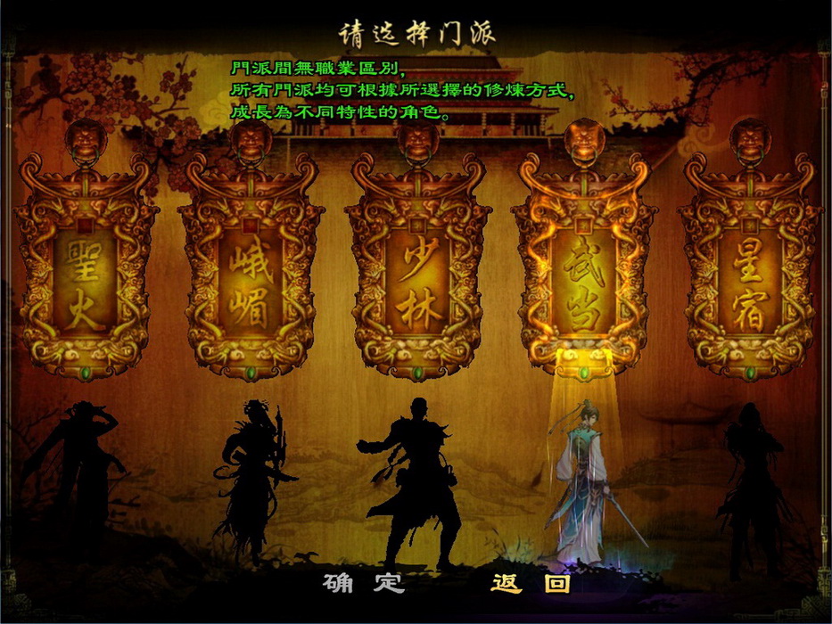 武當、峨嵋、聖火、星宿」,供玩家選擇做為出生門派。
