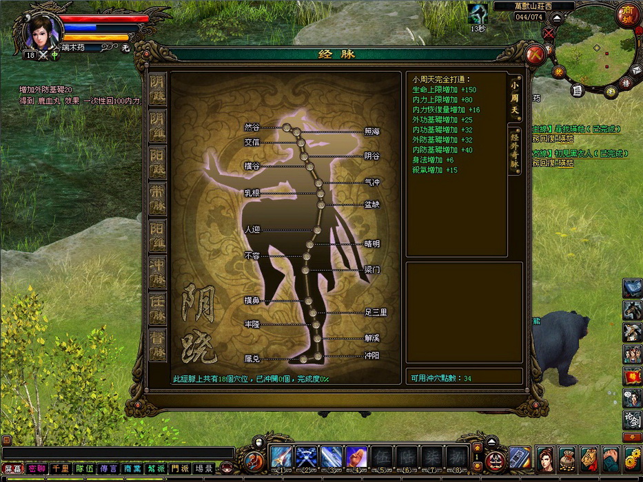 俗話說的好:想成為萬中選一的大俠,必先打通任督二脈,遊戲獨創的經脈系統,忠實地把武俠小說中所敘述的情境完美呈現眼前,打通穴道時會提升能力,一脈打通還會有額外的能力加成,因此徹底打通穴脈,成就真的武林高手,再配合輕功與特殊武功的設定,就可一人一劍,縱橫江湖。