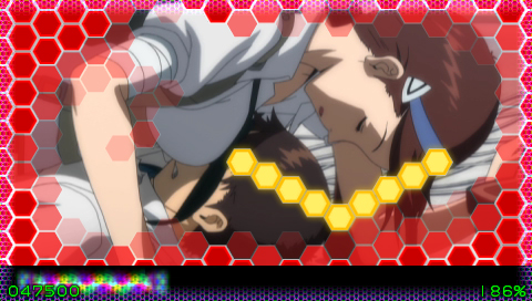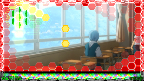 在畫面上覆蓋的 6 角形 HEX 上行走的黃色光條,和特定的 HEX 重疊的時候抓準時機輸入的話,周圍的 HEX 會變薄漸漸露出影片全貌。COOL 判定會翻開 7 張,GOOD 判定 1 張,BAD 判定會產生黑色特效卡住原來翻開的 HEX。