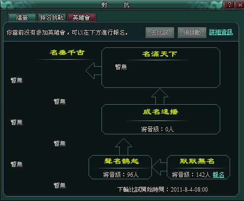每組第 1 名將晉級,第 3-6 名則降級,第 2 名無變化。例如,第二層有 64 個組,則每組威望第一的玩家將晉級到第三層,第二層第 3-6 名的玩家則降級進入第一層,如第二層人數不滿時,則無人降級,並且從下層依次取人額外晉級(初始 1-4 層可晉級人數分別為 384、96、24、6,第 5 層為最高層無人晉級)。每人在每輪有 1 次強化機會(豁盡一戰),1 次弱化機會(培元養息),對自身及俠客全部屬性增加或減少 10%,使用 1 次弱化機會後,可使用的強化機會 +1,兩種機會都可以消耗元寶增加使用次數,此效果僅作用與英雄會,持續 4 小時。