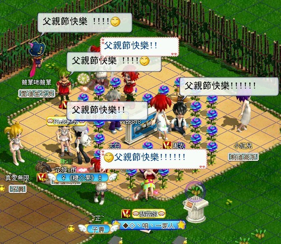 玩家只要在自家莊園的廣告牌、塗鴉板上,寫上『爸爸我愛您!!祝您父親節快樂』,用花朵,8的倍數排出一個大愛心,將大廣告板或塗鴉板放置花叢中間,就可獲得「頂天立地」。是不是超簡單的呢?趕快去向花草小販買花去吧!