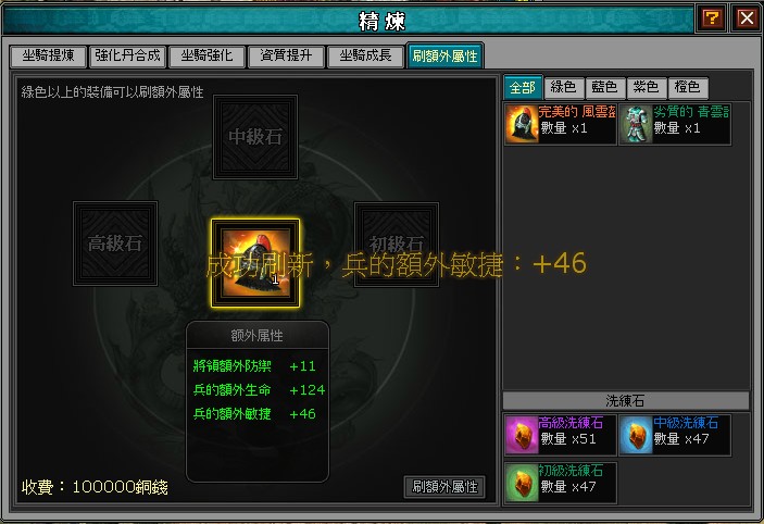 另外一個改版重點是裝備刷附加屬性功能,玩家在『開封-精煉鋪』打開精煉頁面,可以看到『刷額外屬性』的選項,接著使用初擊屬性石、中級洗鍊石、高級洗鍊石道具,便可為裝備增加士兵額外生命、將領額外攻擊、將領額外防禦等屬性效果,從而增強將領的戰鬥力,與原有效果、鑲嵌效果、套裝效果、裝備強化均不衝突,可以完美疊加,大大提升戰力。