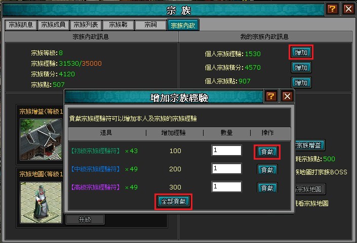 宗族增益是一個能夠增加宗族所屬成員武將屬性的一個功能,宗族成員可以透過宗族積分來升級宗族增益,宗族增益等級越高,宗族增益效果越強,開啟宗族增益後宗族成員獲得的屬性增益就更強;另外,在宗族地圖當中還有『宗族BOSS』,宗族地圖等級超過1級就有宗族BOSS,消耗一定的宗族積分可以升級宗族地圖,宗族BOSS等級越高、重生時間越短、掉落的獎勵更豐厚,點擊遊戲介面右上角的『進入他族地圖』按鈕,玩家可以挑戰其他宗族的宗族BOSS,挑戰高等BOSS成功將會隨機獲得天外隕石、鳳凰坐騎、玄武坐騎、橙色藏寶圖、