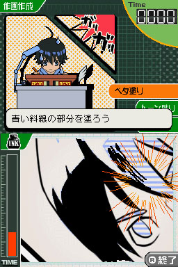 原作成功完成之後,就要交給最哥把原作畫成漫畫原稿。在這個部分要使用觸控筆,分別完成將灰色的線描繪成實線的「描線(ペン入れ)」,以及將指定部分上色的「塗黑(ベタ塗り)」等等工作。並且還會有限制時間,要是失誤的話時間會漸漸減少,需要細心且集中的進行作畫。
