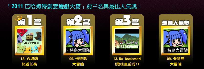 本次「2011 巴哈姆特創意遊戲設計大賽」報名踴躍,26 件參賽作品都是個人或團隊的嘔心瀝血之作。本次的得獎遊戲已經出爐,由站內評選與玩家投票所選出的本屆前三名與最佳人氣獎遊戲作品,未來各位玩家也可以在 ACG 資料庫中