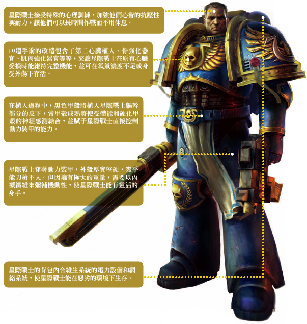星際戰士是人類為了戰爭的終極發展成果,並實現了帝皇的偉大遠征。他們是抵抗外來種族侵略的終極武器,也是人類最後的救星。他們是從數十億人民中挑選出來的菁英人類,並接受星際戰士的基因工程與無數年的訓練,很多新兵無法撐過這個考驗。裝備在 7 英尺高的裝甲中,星際戰士看起來令人敬畏,但許多人將無法活著看到。
