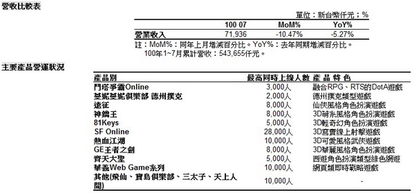 SF Online》推出全新狙擊槍款,且電競賽事不斷,成為7月營收主力,總體營收表現仍在預期範圍之內。累計100年1到7月營收543,655仟元。