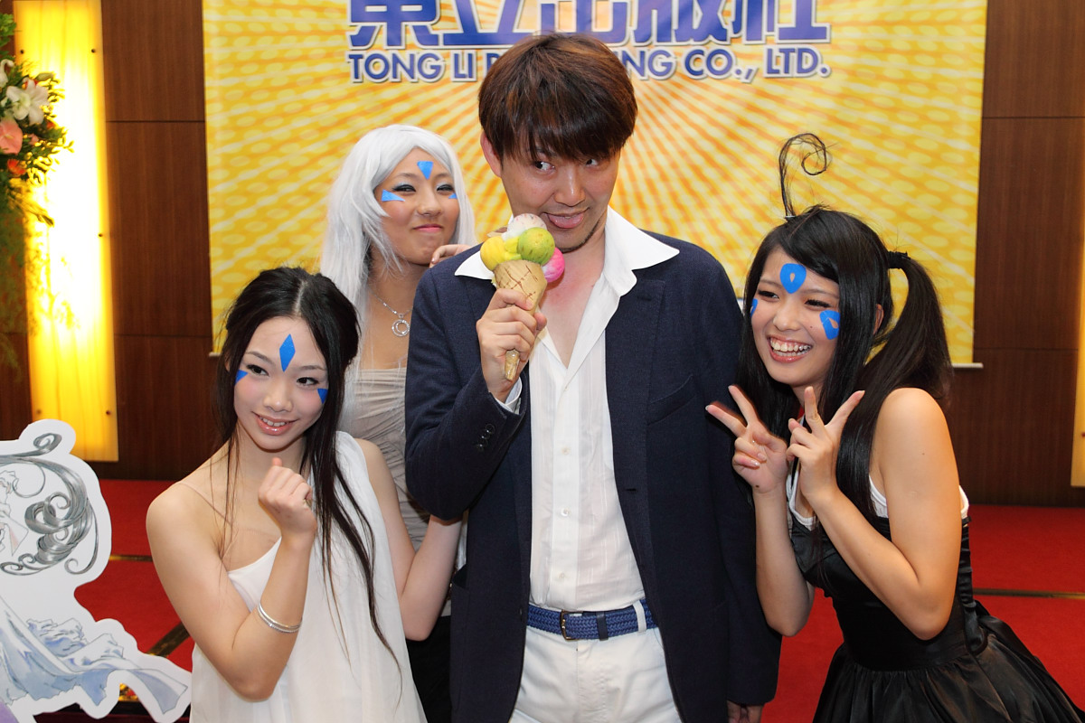 ![與 3 位女神 Coser 合影時露出搞笑的神情]() |