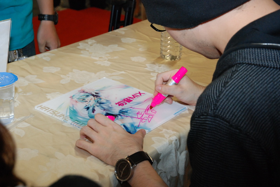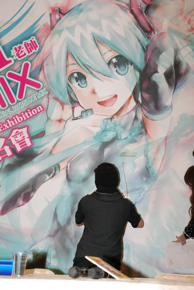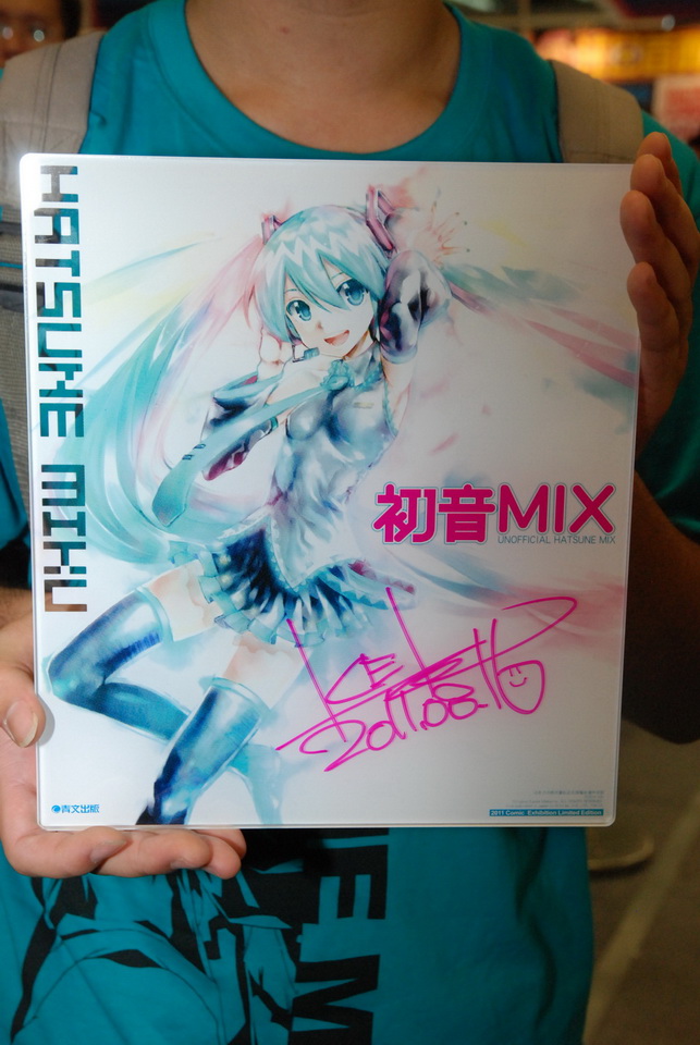 在簽名會開始前,除了有 Coser 以「World is Mine」一曲的熱舞表演暖場之外,更有 KEI 親自帶來的大禮--初音未來親自現「聲」向台灣的大家問好,並預祝活動順利圓滿。