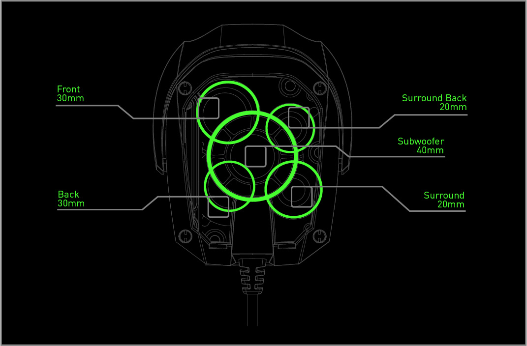 Razer Tiamat 迪亞海魔 7.1 環繞聲道遊戲耳麥配備 10 個獨立驅動器,在每個頭戴式耳罩上具備有 5 個驅動器,提供精準定位環繞音效。10 個驅動器提供 7 個環繞聲道與重低音聲道,分別為:2 個中央聲道、左右聲道、左右環繞聲道、左後與右後環繞聲道,以及兩個超低音聲道。