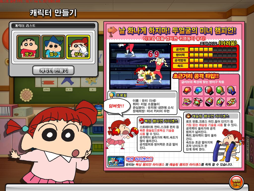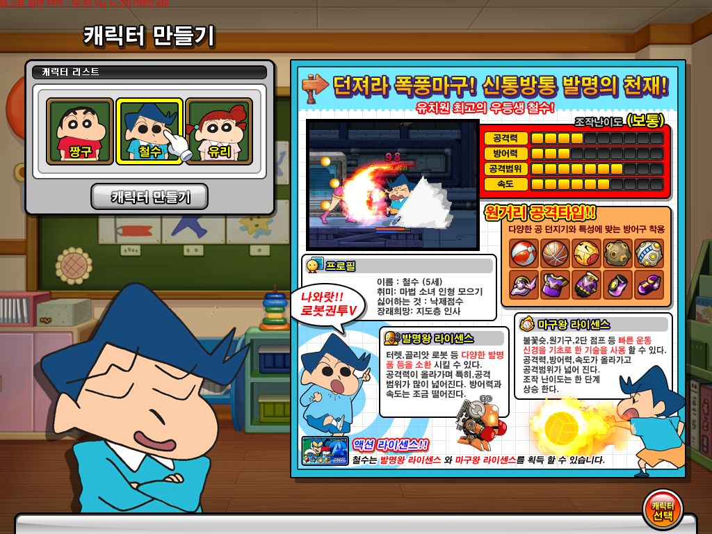 遊戲開始前我們可自由選擇扮演的人物,包含「野原新之助」、「風間徹」、「櫻田妮妮」等 3 位知名角色,每位角色都有各自攻擊方式與能力。