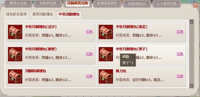武林英雄》順勢推出”集月餅送好禮”活動,即日起至9月12日止,玩家在指定任務中,成功收集各種做餅材料後,即可兌換“中秋月餅禮包”,內容為“豆沙”“棗泥”“蓮蓉”“栗子”月餅,月餅功效可增加經驗值及精力;此外,在9月12日至9月18日《