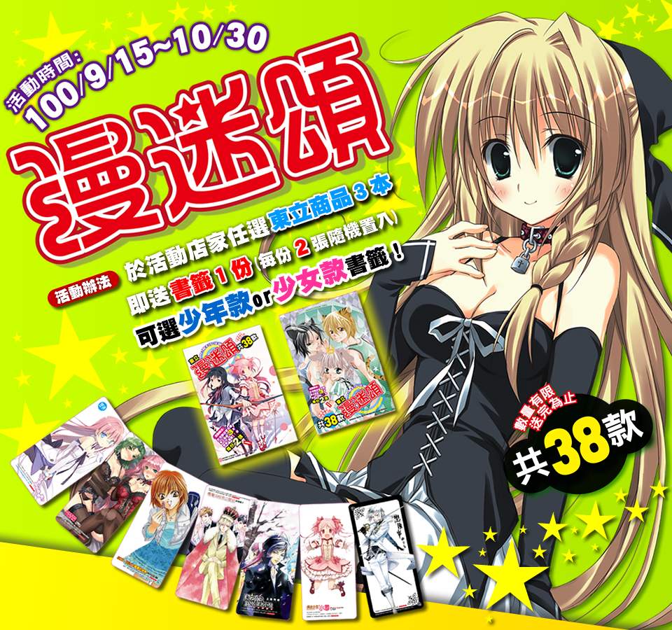 這檔堪稱漫畫界最強回饋活動──『漫迷頌』,活動日期從 100 年 9 月 15 日到 10 月 30 日為止,凡任選購買東立出版品,不管是漫畫或是輕小說,滿三本即送『漫迷頌』活動書籤組1份(每份2張),超精美圖樣隨機置入,迷迷們可以選擇「少女系列」或是「少年系列」書籤組,但恕不接受挑選作品圖樣喔!重點是數量有限、送完為止,若是各位漫迷晚一步就無法蒐齊心愛作品的書籤卡囉!
