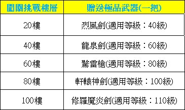 活動內容:活動當天,只要挑戰成功【千重樓】中各項指定樓層,活動結束後將可獲贈不同對應的『極品武器』一把,每個角色一個伺服器僅限領取一次獎勵。