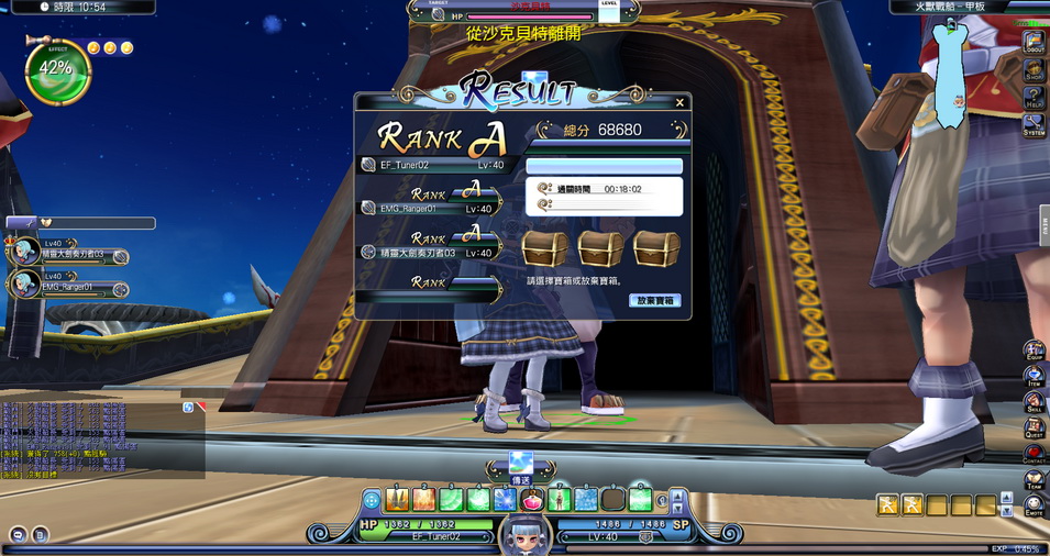 終於在團隊合作下,火獸船長血量開始亮紅燈,再奮力一擊、打敗了火獸船長,NPC 開始歡呼,之後會顯示角色的表現評等,並可以選擇寶箱。