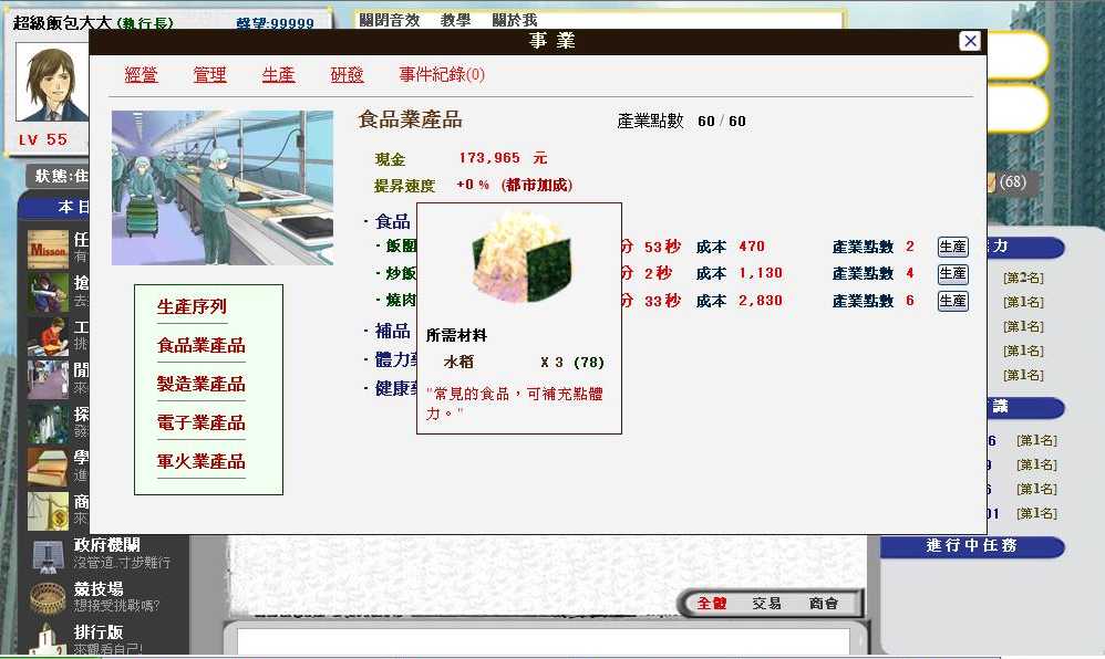 遊戲橫跨食品、製造、電子、軍火四大產業,超過 500 項的獨特商品,要憑玩家自己的投資眼光與商業直覺,想辦法追求利潤的極大化,成為一名前無古人,後無來者的企業鉅富。