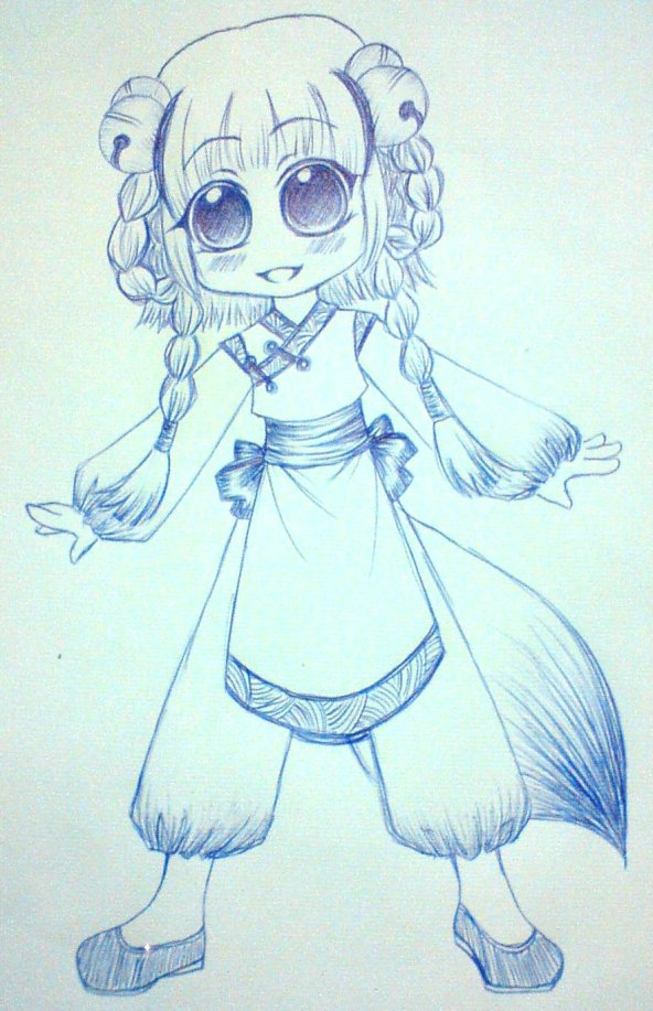 作品說明:被木鬚龍教壞的小鈴兒。木鬚:「挺胸!岔開腿!!」,小鈴兒:「是的!!」...其實是自己不小心把腳畫太開 囧"。這張是原子筆的即興塗鴉!