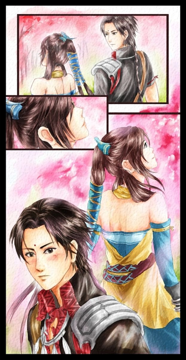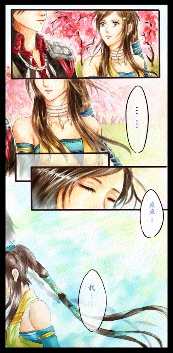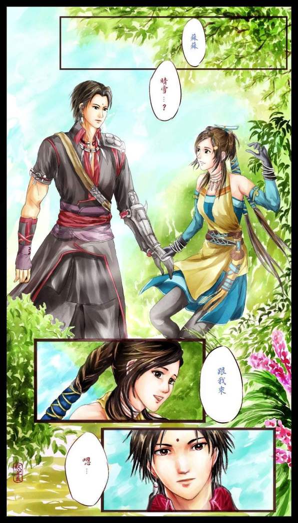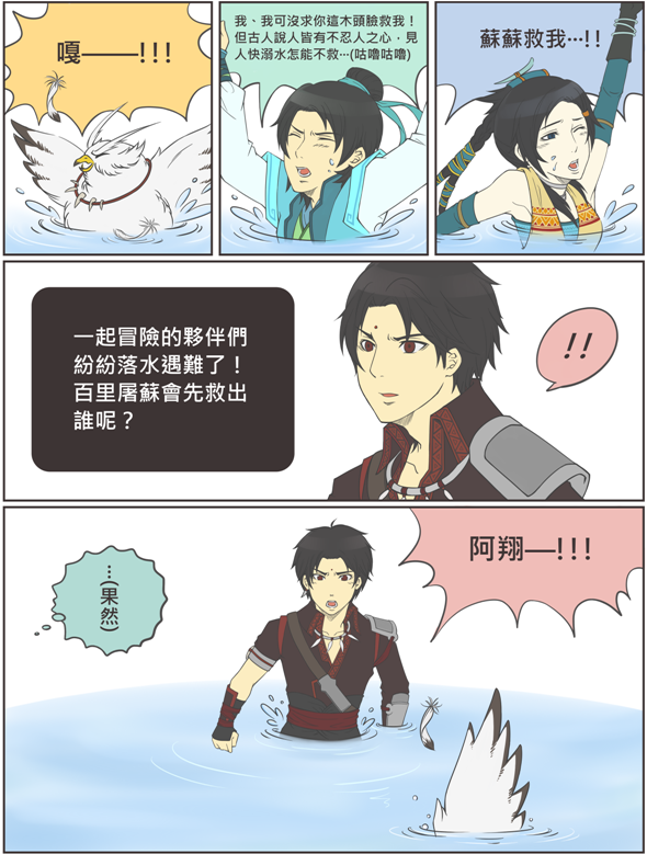 作品說明:當初決定要參加投稿時遊戲只玩到一半,對人物的背景和之間的關係還不是相當了解,於是我問已經玩過一回的朋友說:除了晴雪之外,你覺得蘇蘇跟誰最配?本以為最勁爆的答案頂多是小蘭,沒想到他回答我「阿翔!」於是這份作品就誕生了(笑),為了呈現出在蘇蘇心中孰優孰劣,這裡借用了「妻母溺水」的典故做為靈感,希望大家會喜歡。