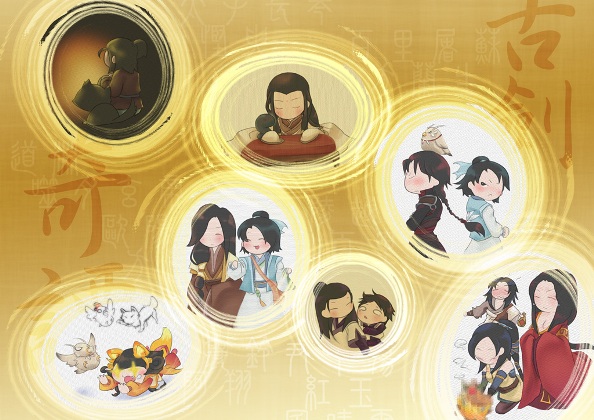 作品說明:古劍日常?主角群的日常和回憶,比較值得一提的是左上角,腦補的[妖狼&道淵]回憶,古劍有很多需要稍微留意才能發現的支線劇情,這點讓我很喜歡。不擅長畫大合圖,於是拆開一組一組畫感情好的同伴…最後才用拙劣的方式拼湊,目前遊戲還沒玩完…因此也漏掉後半出現的角色