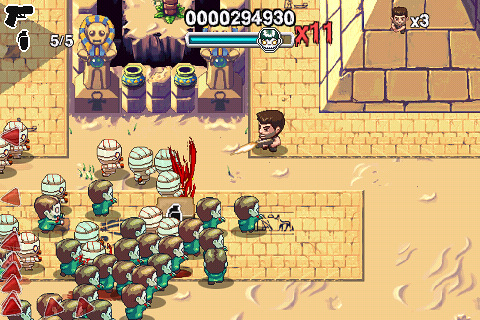 一進入遊戲可以選擇「故事模式(Story)」和「生存模式(Survival)」,故事模式免費版遊戲只能體驗前 3 關,付費版則有 5 個不同時代背景下的 15 個關卡,生存模式也是免費版只有 2 關,付費版則有 8 關。遊戲中 5 個不同時代背景下的殭屍種類很多,東方的忍者殭屍加上西方的木乃伊,甚至有恐龍殭屍當 BOSS,常常被一堆殭屍包圍到無路可退。
