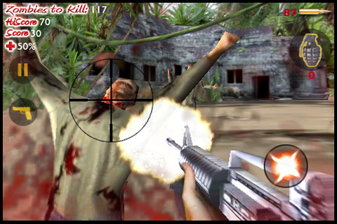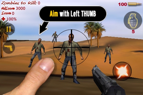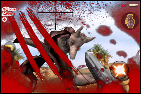 遊戲操作是用左手觸控螢幕上下左右拖曳來移動畫面中央的準心,然後用右邊的開槍鈕射殺殭屍,右上角還會出現其他可使用道具,過程中除了要射殺不斷跑來的殭屍之外,天上飛的生物也不能放過。