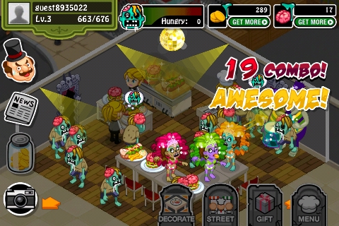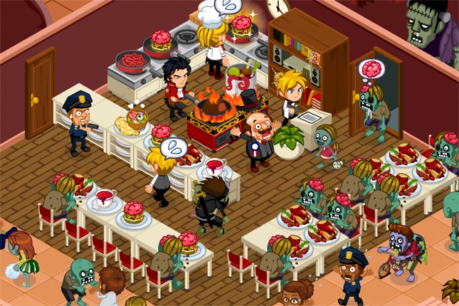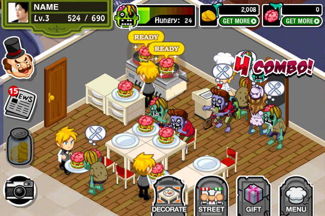 跟一般餐廳經營的遊戲相同,服務生會自動找事情做,玩家只要負責點廚子上的鍋爐「烹飪料理(COOK)」,還要雇用足夠的員工跟餐桌椅來服務殭屍即可。