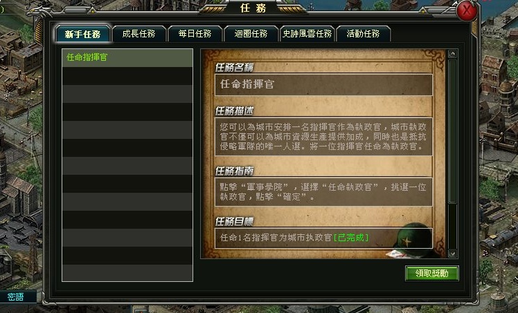 遊戲剛開始會進行一連串詳細的教學導引,讓玩家跟著指示來快速熟悉遊戲的各項操作。新手玩家在初期只要跟著成長任務來發展,就能獲得優渥的任務資源獎勵,為往後的軍事開發奠定基礎。