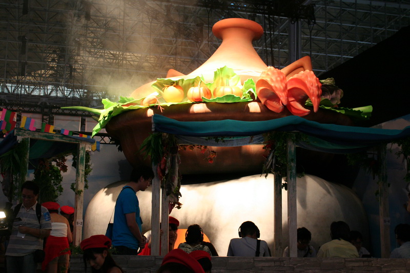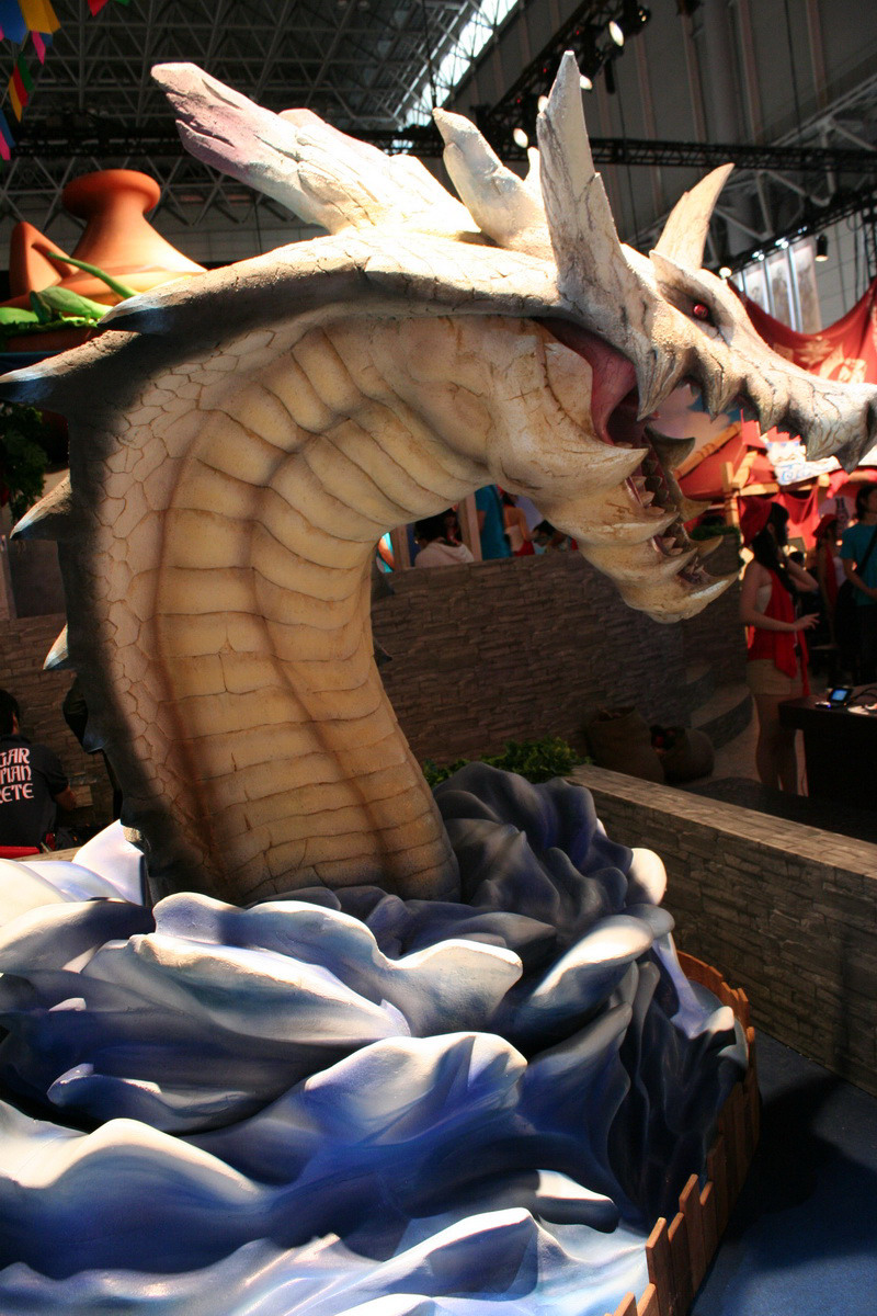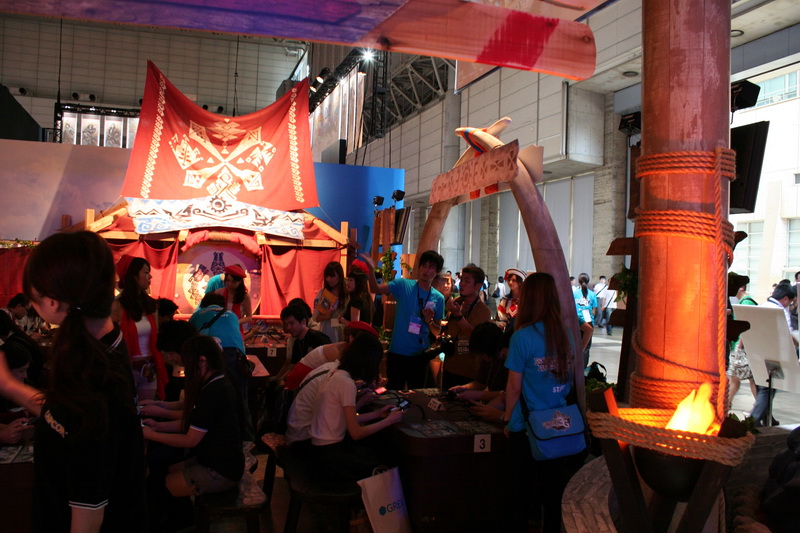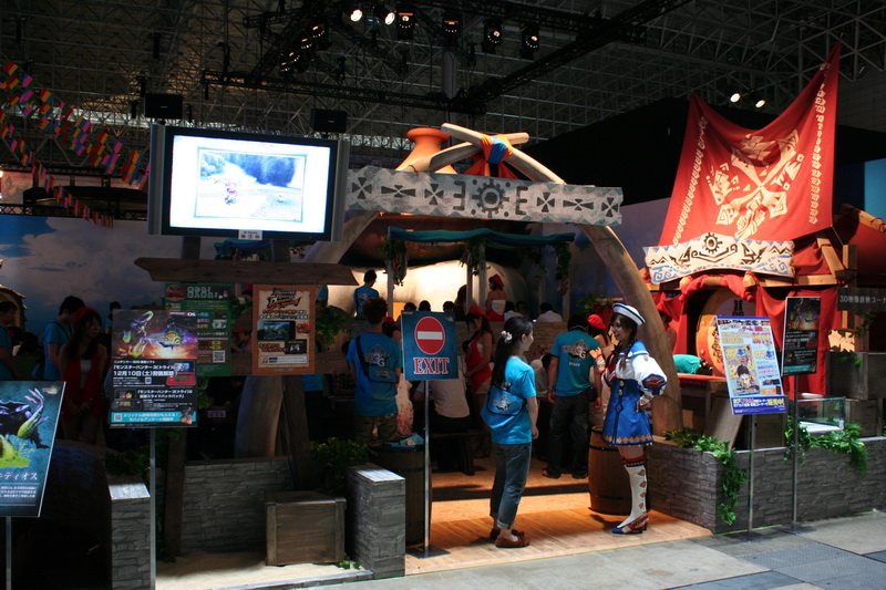 魔物獵人 3 G》新增的多人連線用港口「丹基亞港」為主題來設計。攤位並且設置了本作的新主題魔物-「布拉奇迪沃斯(ブラキディオス)」以及海龍「拉基亞克爾斯(ラギアクルス)」的塑像來點綴,逼真的布景和氣氛不禁讓來攤位試玩的小編有如真的進入了《