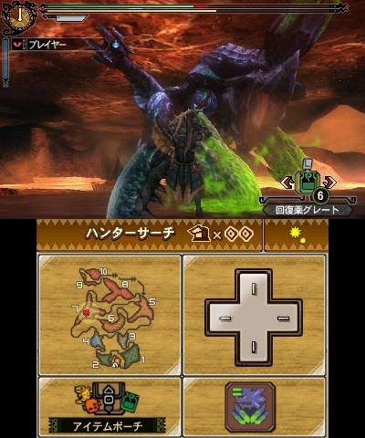 魔物獵人 攜帶版 3rd》相同,狩獵起來相當順手。最令人在意的果然還是為了因應 N3DS 類比墊配置位置,而變得無法使用 PSP 系列俗稱「C 字手」的攝影機操作,而加入的「目標鎖定」功能。打開「目標鎖定 ON」的狀態時,按下 L 鈕的話,鏡頭就會轉到面對魔物的方向,馬上抓住魔物的一舉一動;「目標鎖定 OFF」時,就是一般的操作,按下 L 鈕會轉到獵人的正面。而在實際的操作上的確也需要時間習慣,常常會發生迴避魔物動作之後,忘記按下 L 鈕面向魔物,一回頭就被痛打一頓。而且根據同團的日本玩家說法,弓手時更有致命性的危險,常常會因為 N3DS 和 PSP 相反的類比墊配置,而發生因為瞄準、迴避錯誤而被痛擊的情形發生。