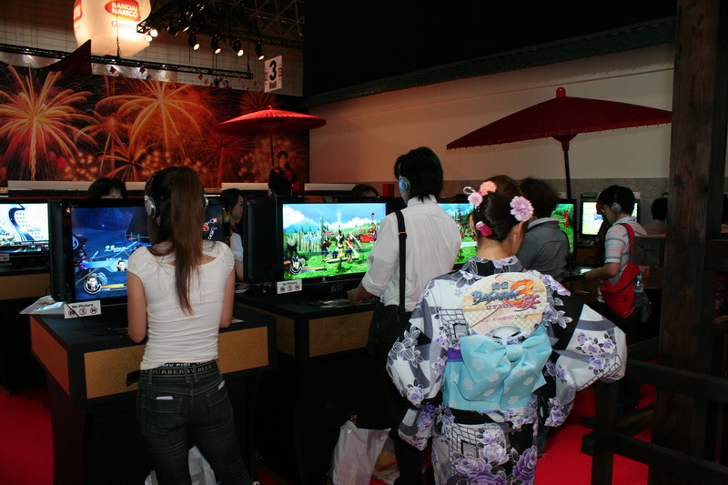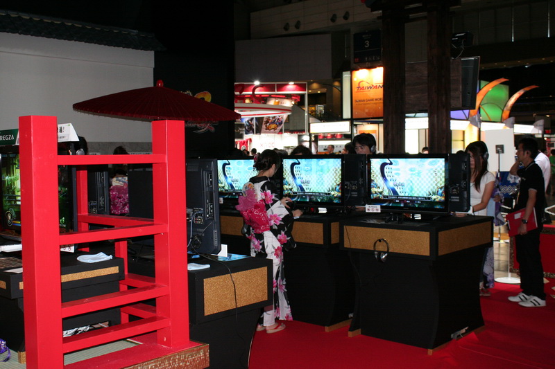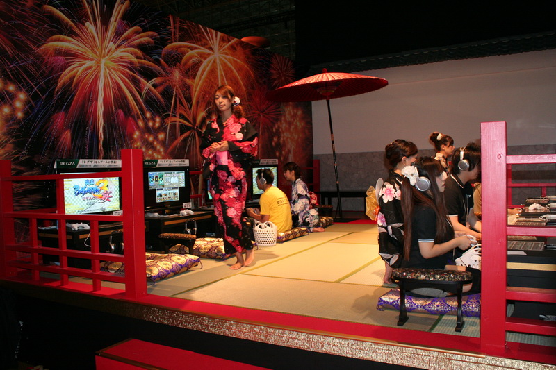 試玩區以巨大的新參戰武將為主要視覺,並且以「祭典」為主題印象,可以看到工作人員們都身著浴衣,再配上試玩區的塌塌米及和式傘,正好契合本作主題,令人感受到有種要參加夏季煙火大會的熱鬧氣氛。
