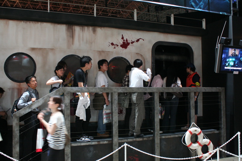 攤位打造成遊戲中的故事背景-擱淺於地中海某處的郵輪,內部也是仿造廢棄郵輪,並且很有氣氛的在各處塗上血漬。試玩後還會附上本作的原聲帶 CD。