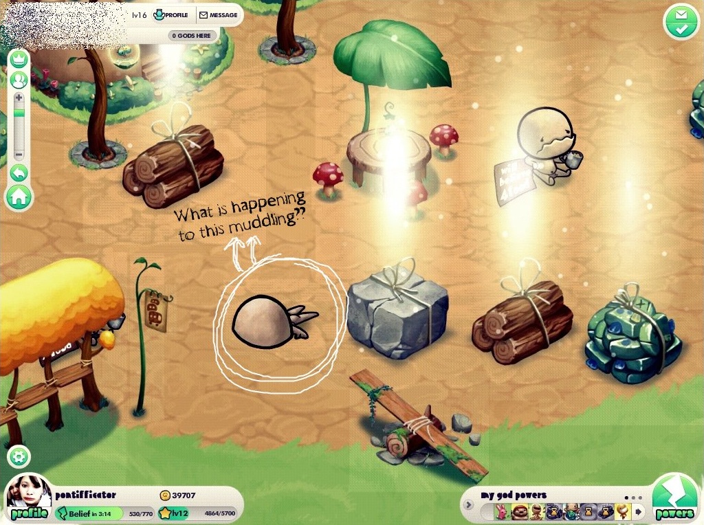 上帝物語》在社群元素方面,透過社交功能打破了玩家之間互不認識的隔閡。例如,一個玩家彈出島嶼的馬德林,可能會落在另一個不認識的 Facebook 玩家島嶼;該玩家則可以造訪您的島嶼,感謝你為他增加馬德林人口,或說服馬德林遠離你的信仰並轉換到別的玩家島嶼。