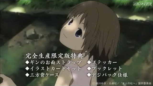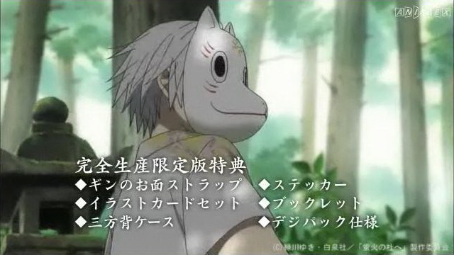 螢火之森》的 BD 與 DVD 將收錄特別影片,預定將在明年 2 月 22 日推出,一般版 DVD 含稅定價為 5040 日圓;而完全生產限定版 BD 及 DVD 含稅定價分別為 6930 日圓及 5880 日圓,特典將包含男主角的面具吊飾、插畫寫真卡組、貼紙、收藏盒、光碟收藏殼、以及小冊子等,光碟,提供給有興趣的人作參考。