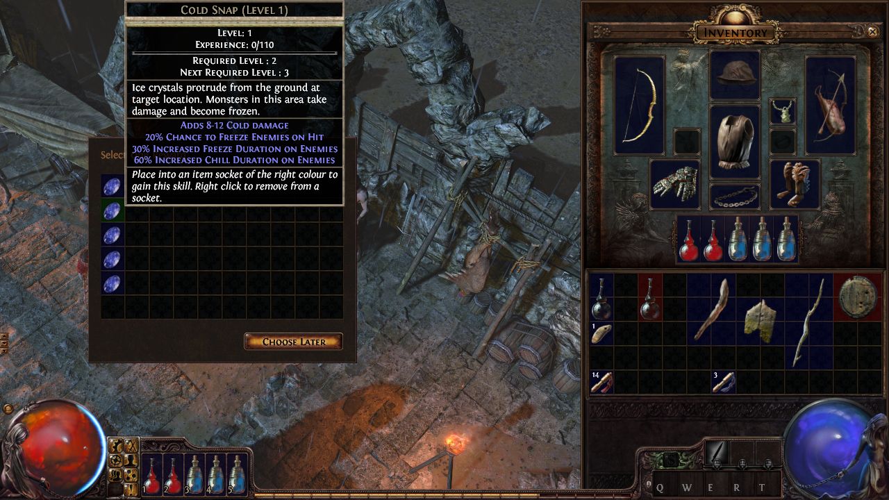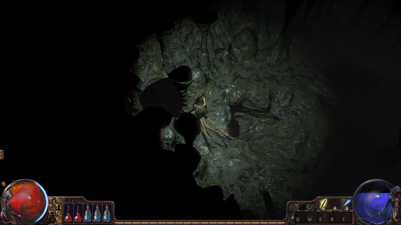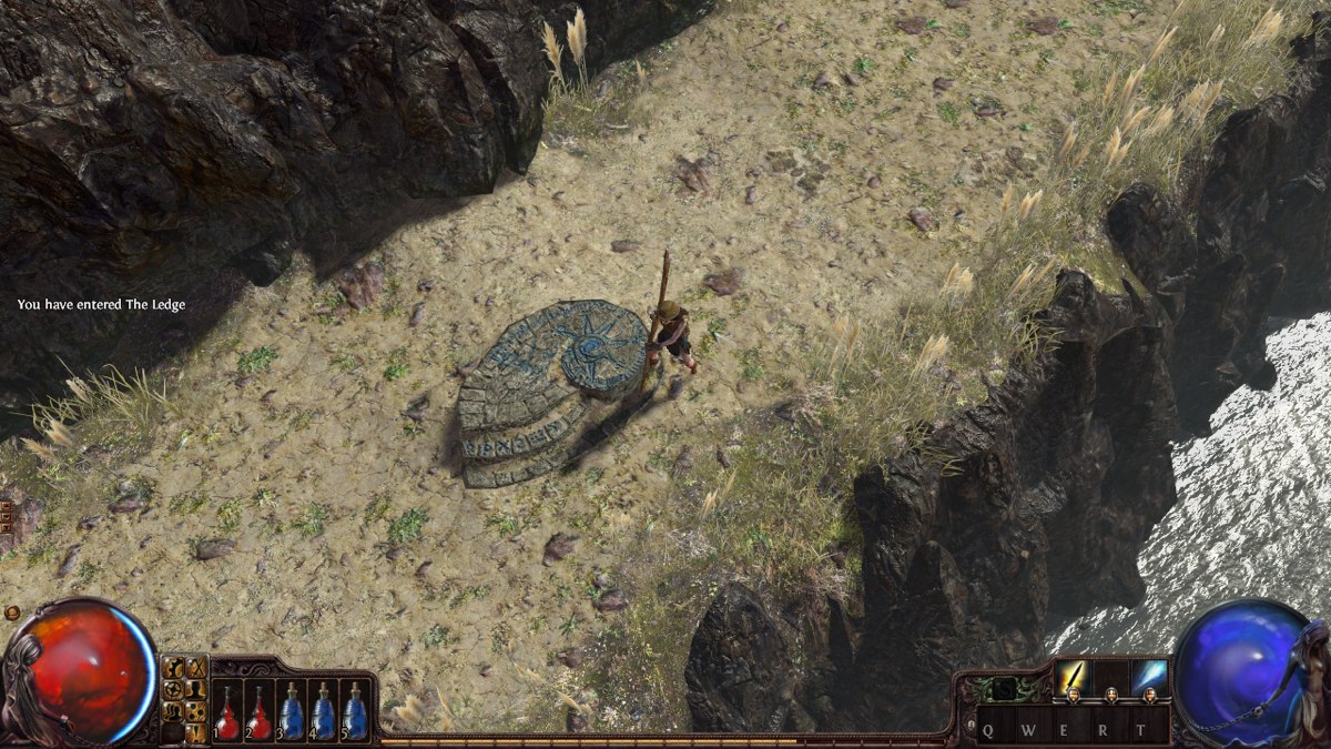 選擇好角色後,可以看到主角因某種原因而被放逐到這個充斥著大量殭屍、怪物的神秘大陸「瑞卡拉斯(Wraeclast)」,為了生存只好撿起武器來對抗敵人。一開始玩家可與身旁瀕死的冒險者對話了解目前的情況,接著在冒險者身旁能發現一把素質不錯的武器,這把武器最主要的特色是能同時鑲嵌3顆屬性技能寶石,在前期是非常難取得的。