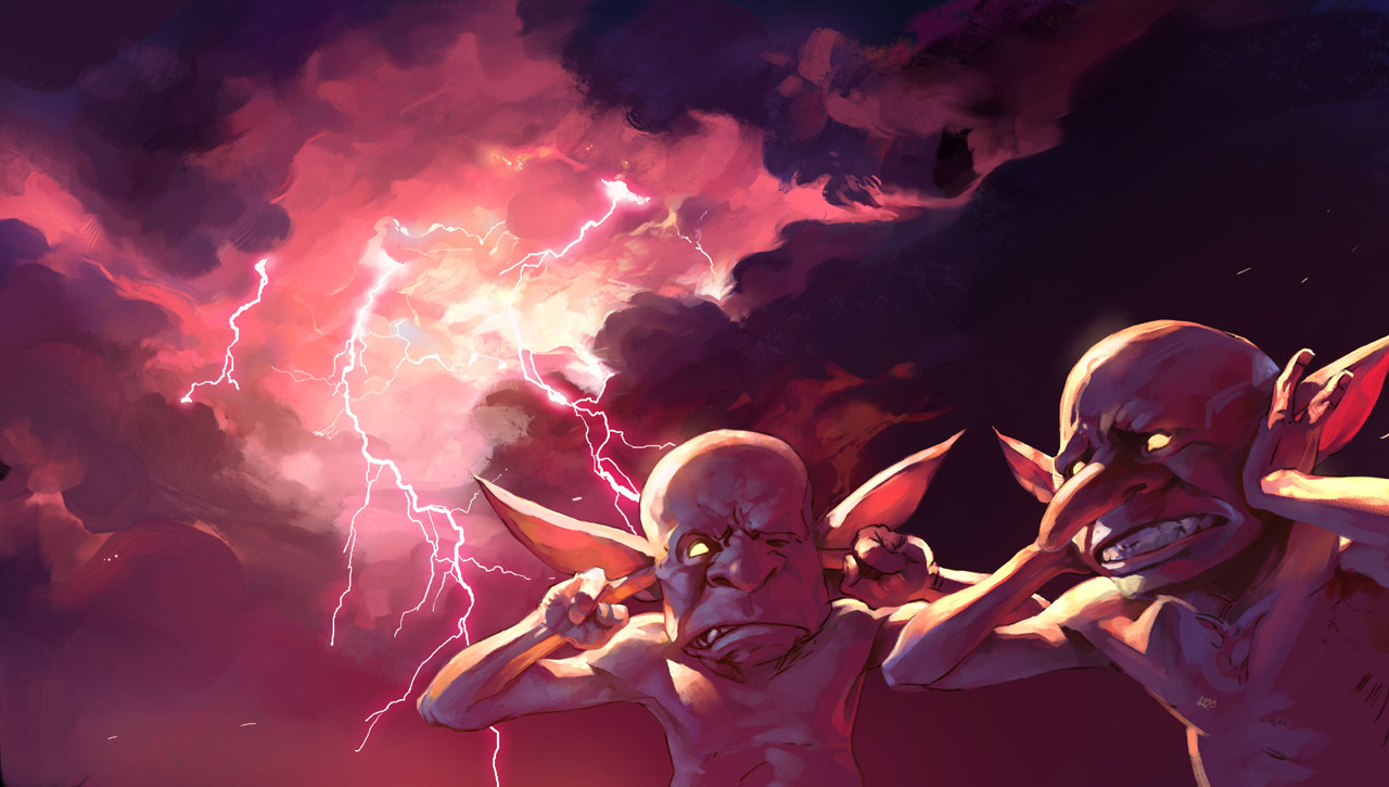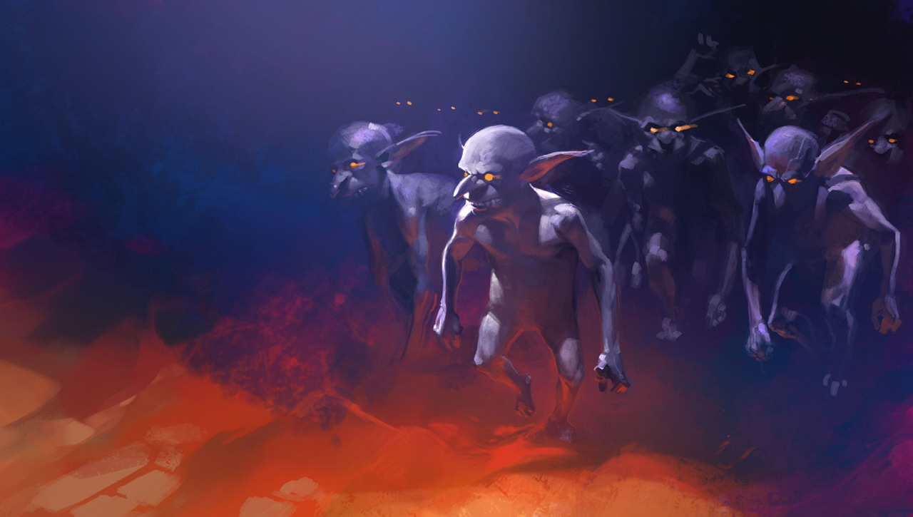 住在地獄的底層力量薄弱的魔神。智商低又膽小。但繁殖力強會不斷增殖。為了躲避強力的惡魔們而在地獄的邊境過著原始的生活,但由於魔王的魔術而獲得知性,得到了使用魔法以及武器的力量。更進一步貪食強力魔神們的血肉的話,膽小的哥布林們會漸漸變的越來越猙獰兇猛。