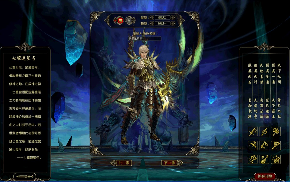 在九刃角色建立畫面中,玩家們可以先預覽九把神兵利器,並選擇一把自己最喜歡的武器進入遊戲。