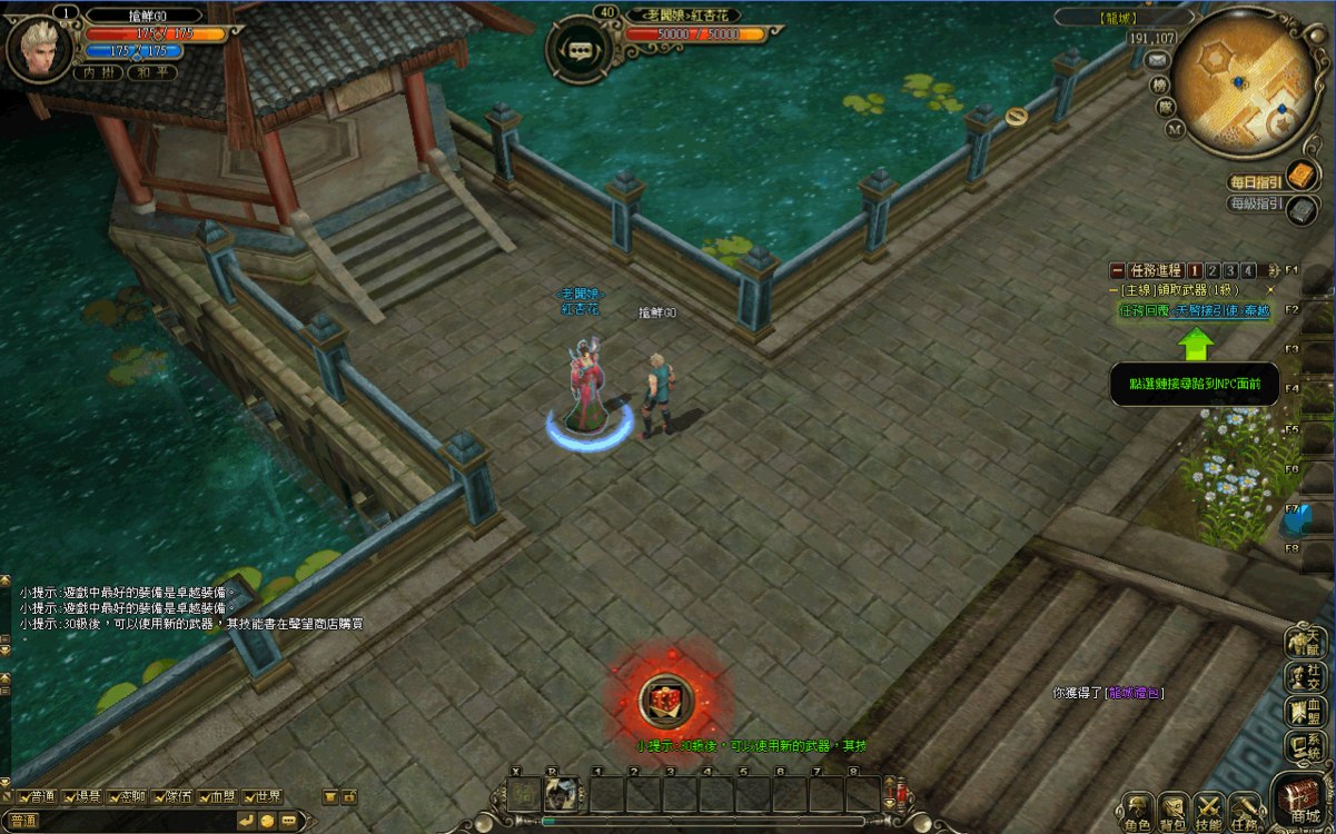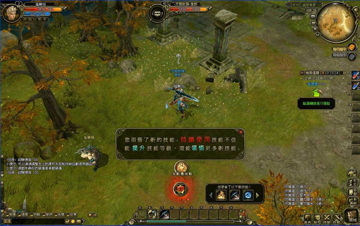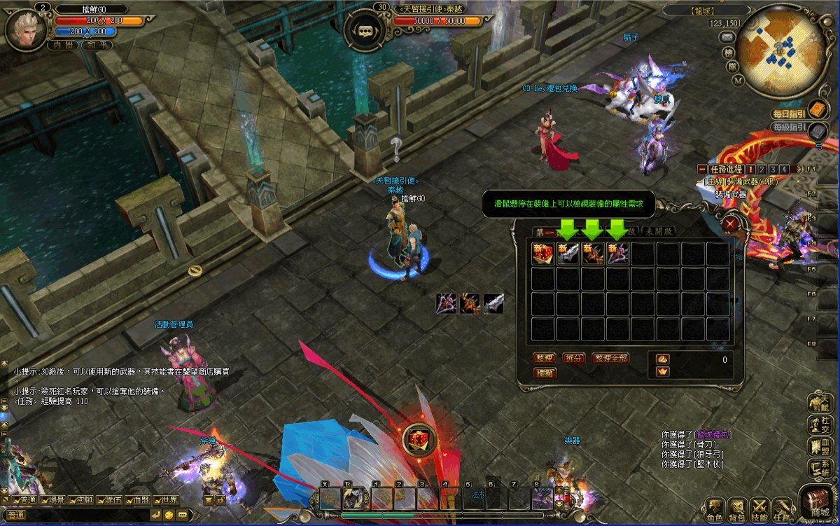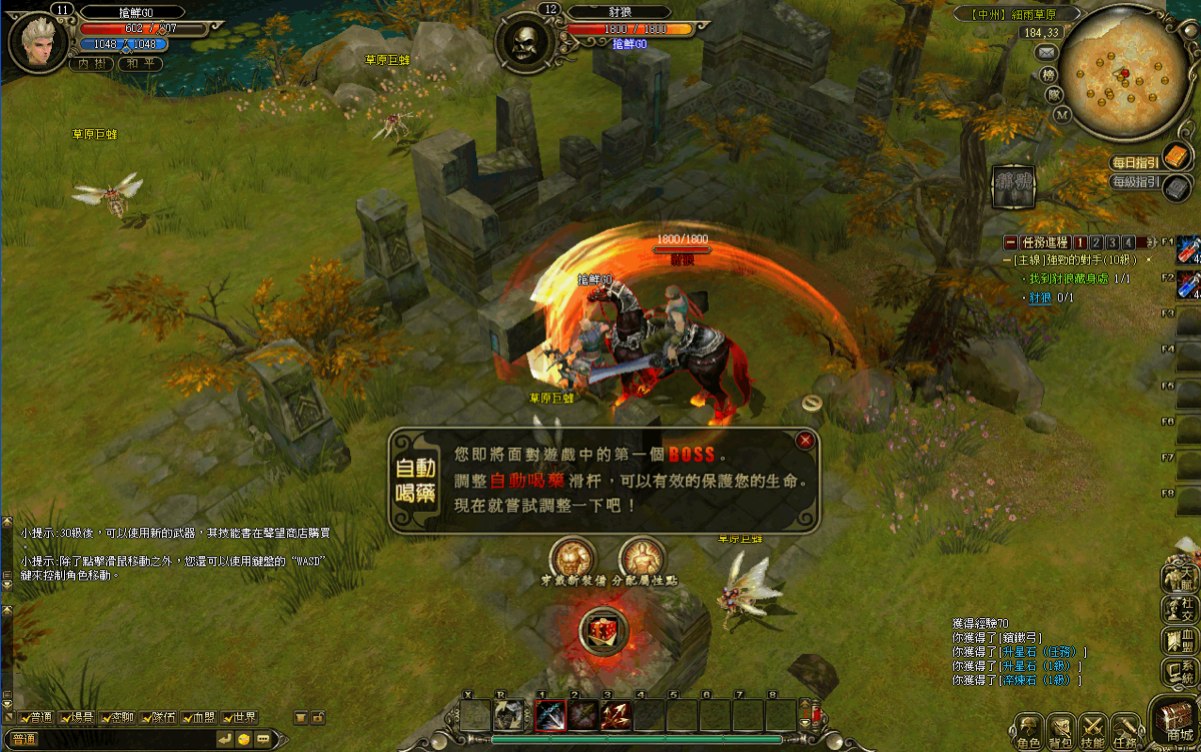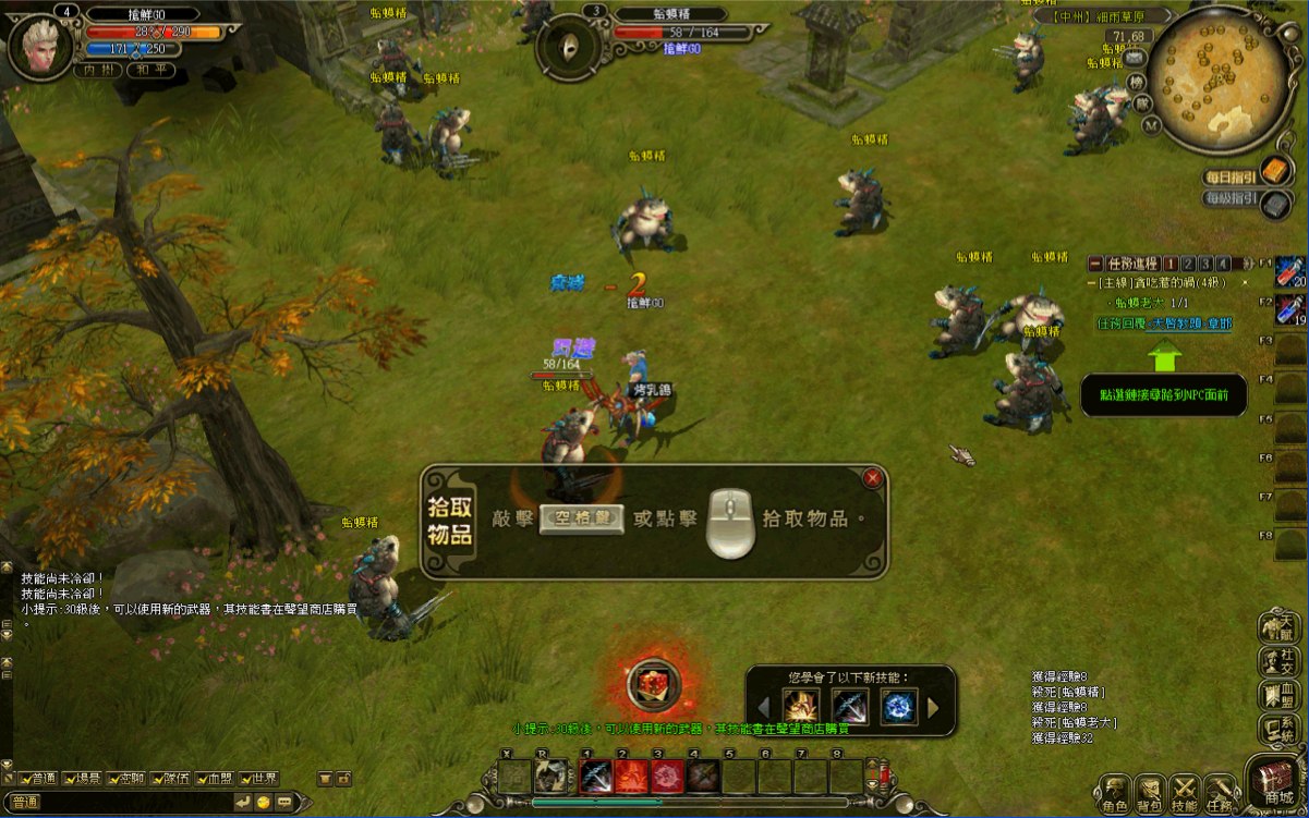 在野外打怪提升等級的同時,怪物總會掉落不少補品、裝備,遊戲系統提示也會告訴玩家拾取物品的方法:點