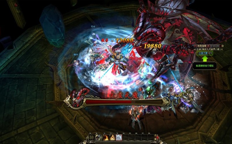 一進入遊戲玩家就得和強大的太虛天魔進行決鬥,不過玩家們可別害怕,有其他 8 位神將幫忙,即可輕易打倒他。玩家只要依照畫面提示點擊「滑鼠右鍵」對準目標,再配合鍵盤數字鍵 1~3 施放技能,即可完成任務。