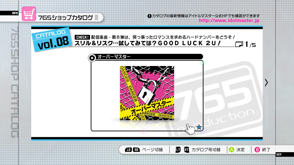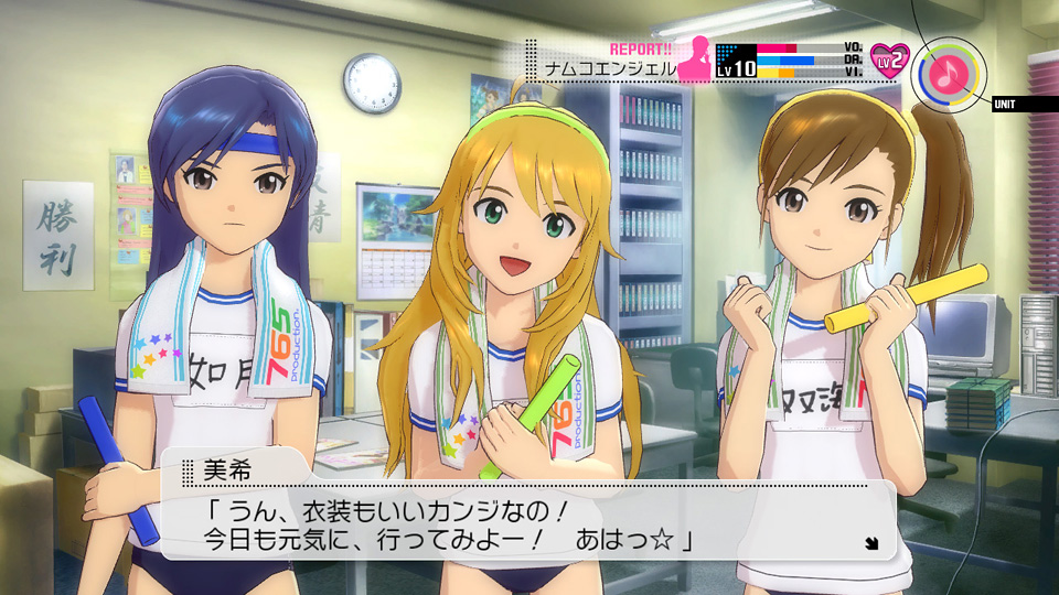 偶像大師 SP》初次登場的歌曲「Over Master」、洋溢青春活力的額外服裝「新體育服」、趣味可愛風的配件、第 8 波 DLC 完成特典「萩原組安全頭盔」、遊戲幣與偶像郵件信箱等內容,價格 200~1200 微軟點數。