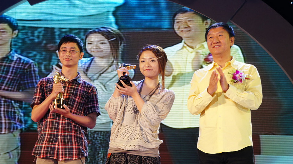 | 左起為獲最佳少年漫畫獎的 L.M、最佳少女漫畫獎得主顆粒、以及金龍獎組委會主任金城 |