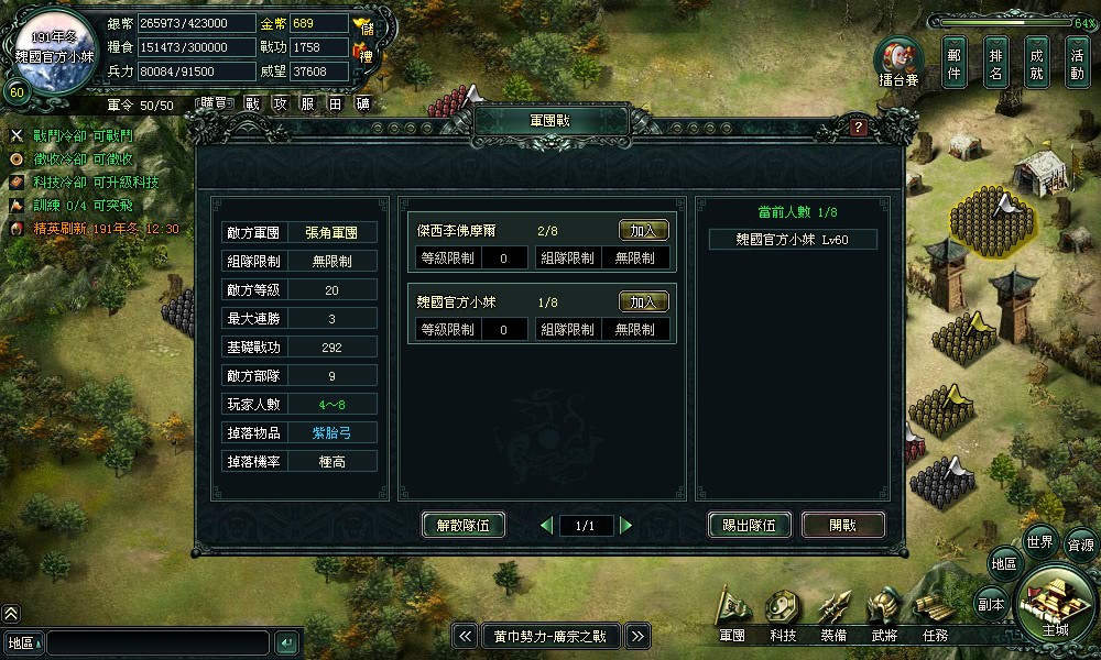 10 月 17 日至 10 月 26 日晚 21:00-22:00,臥龍官方小妹(魏蜀吳)在「黃巾勢力-廣宗之戰」地區創建團隊,搶先加入臥龍官方小妹隊伍,並且成功幫助小妹擊敗張角軍團的所有玩家都將獲得 108 金幣獎勵。